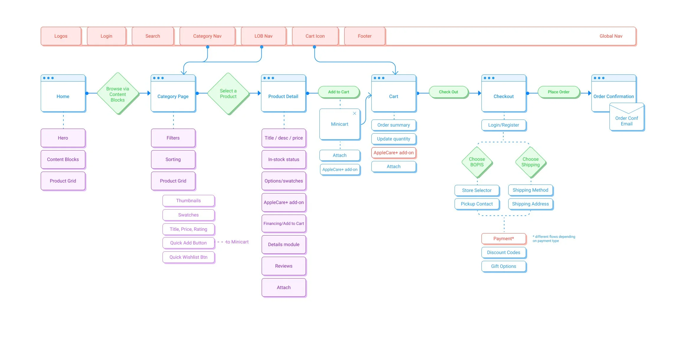 The goal was to create an Apple branded UI experience that worked across the e-commerce platform for various Apple Authorized Resellers. I defined my approach by keeping three core values in mind; scaleability, accessibility, and consistency. To achieve this I focused on building an Atomic Design System that contained all UI components. The key challenge of Apple’s request was, “Making it look like Apple, but not Apple.”